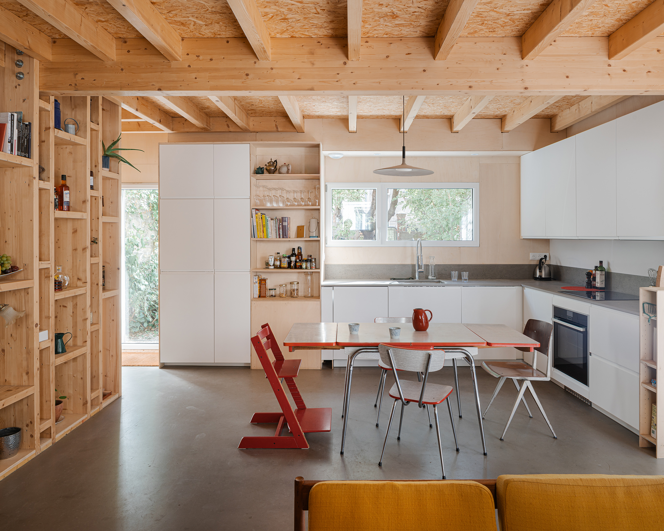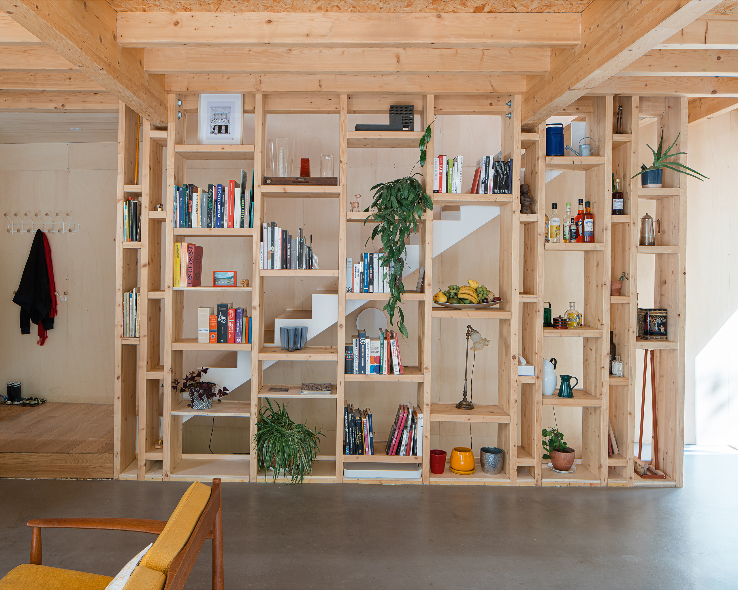 Sur un plan de niveau de dimension restreinte, elle organise la vie de la famille autour d’un grand escalier bibliothèque, cette dernière n’étant autre qu’un des murs à ossature bois de la maison, dont il redivise la portée, laissé ouvert pour utiliser cet espace. Le rez-de-chaussée est occupé par les pièces de vie, les espaces des parents sont au premier, les chambres des enfants au second. L’attique est un second salon et bureau, ouvert sur une grande terrasse à l’ouest à la vue imprenable.