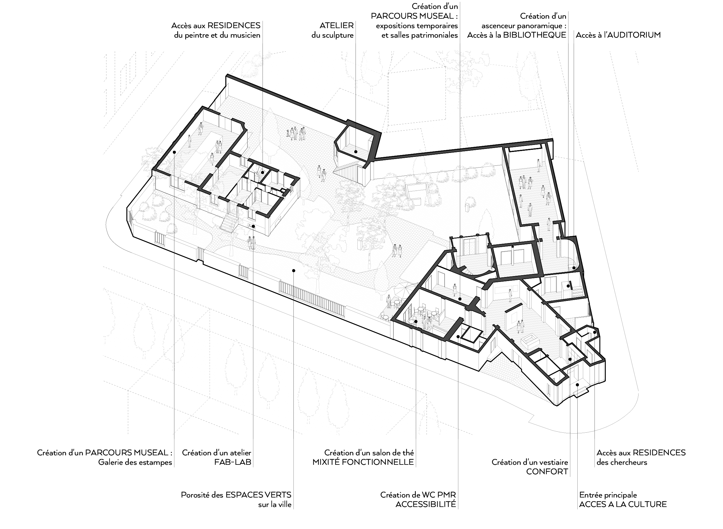 Nous avons remporté deux appels d’offres (phases 1&2) ce qui nous amène à la réalisation d’un projet d’ensemble pour ce site aux fonctions imbriquées : espaces d’accueil et d’exposition permanentes (collection d’estampes de Paul Marmottan) et temporaires, bibliothèque spécialisée, salon de thé, résidences d’artistes et de chercheurs, auditorium. Cette singularité en fait un lieu hybride et vivant que nous cherchons à ouvrir sur la ville.